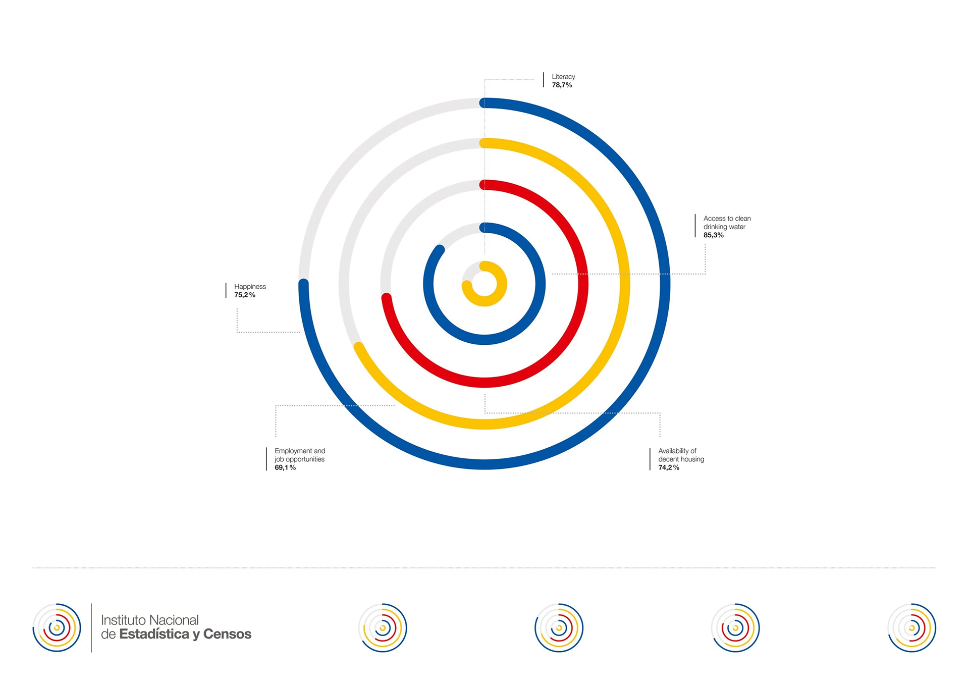 INEC, Ecuador’s official government organisation for statistics, has the mission and the power to not only collect data, but also to distribute the information, making sure the entire country has access to it. The creative idea for the relaunch of its corporate design was to present the data reflecting the wellbeing of the population visually and in real time. A logo composed of five concentric circles was developed to represent the fields of literacy, access to clean drinking water, availability of decent housing, employment and job opportunities, and happiness. Each circle is a variable which is colour-coded in a colour of Ecuador’s flag, according to the state of their evolution. Based on INEC’s data, the logo updates automatically and constantly. Moreover, as variables change, the form of the logo transforms. In order to communicate the idea and to create interest among Ecuadorians, the logo idea was translated into a series of image posters, each representing a year or a month, displaying the data collected in that timeframe.