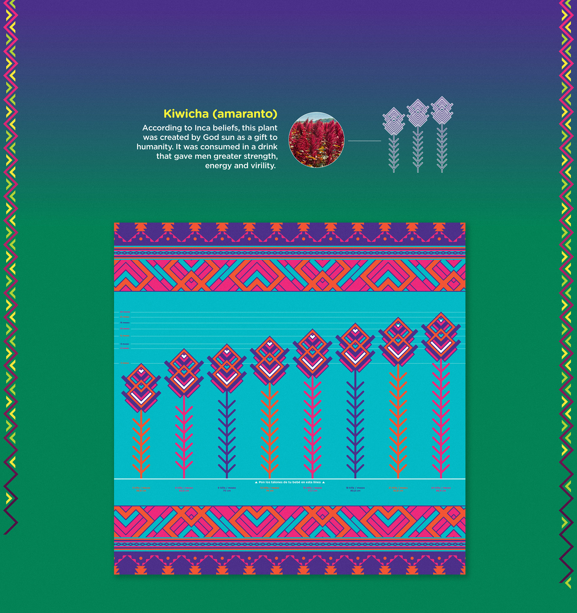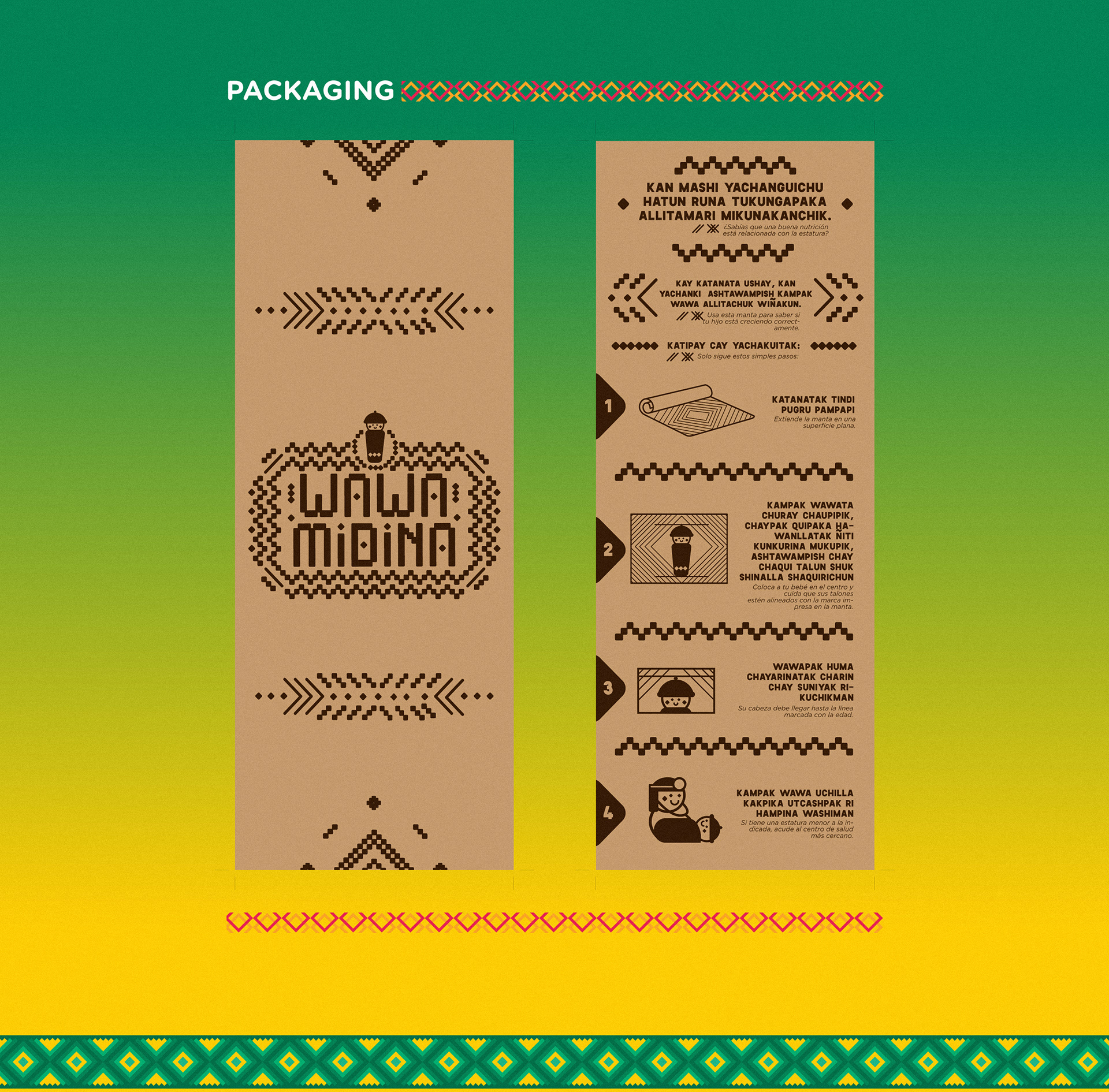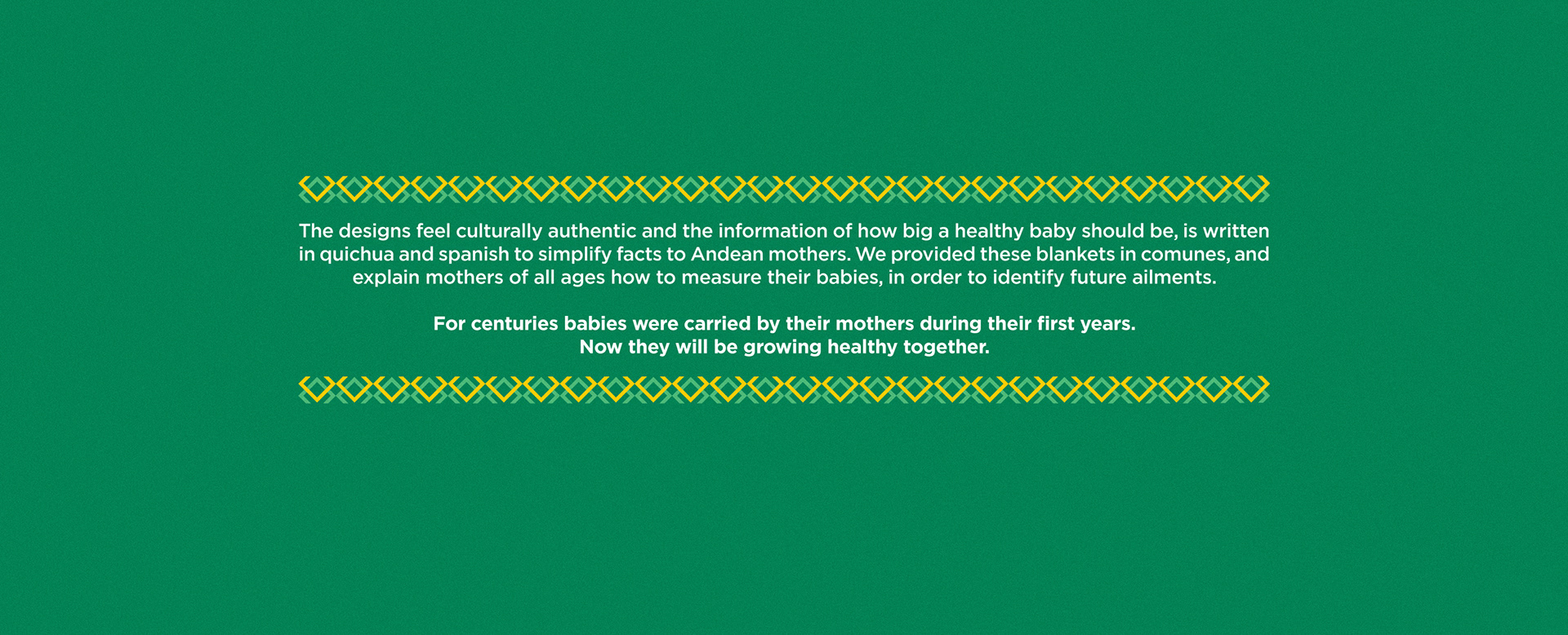 Inspired in the closest connection Andean mothers have their babies, the “Sikinchi”. We redesigned the OMS Infant Growth Chart and printed it into blankets to help Andean mothers keeping track of their babies development. The designs feel culturally authentic and the information of how big a healthy baby should be, is written in quichua and spanish to simplify facts to Andean mothers. We provided these blankets in comunes. And explain mothers of all ages how to measure their babies, in order to identify future ailments. For centuries babies were carried by their mothers during their first years. Now they will be growing healthy together.